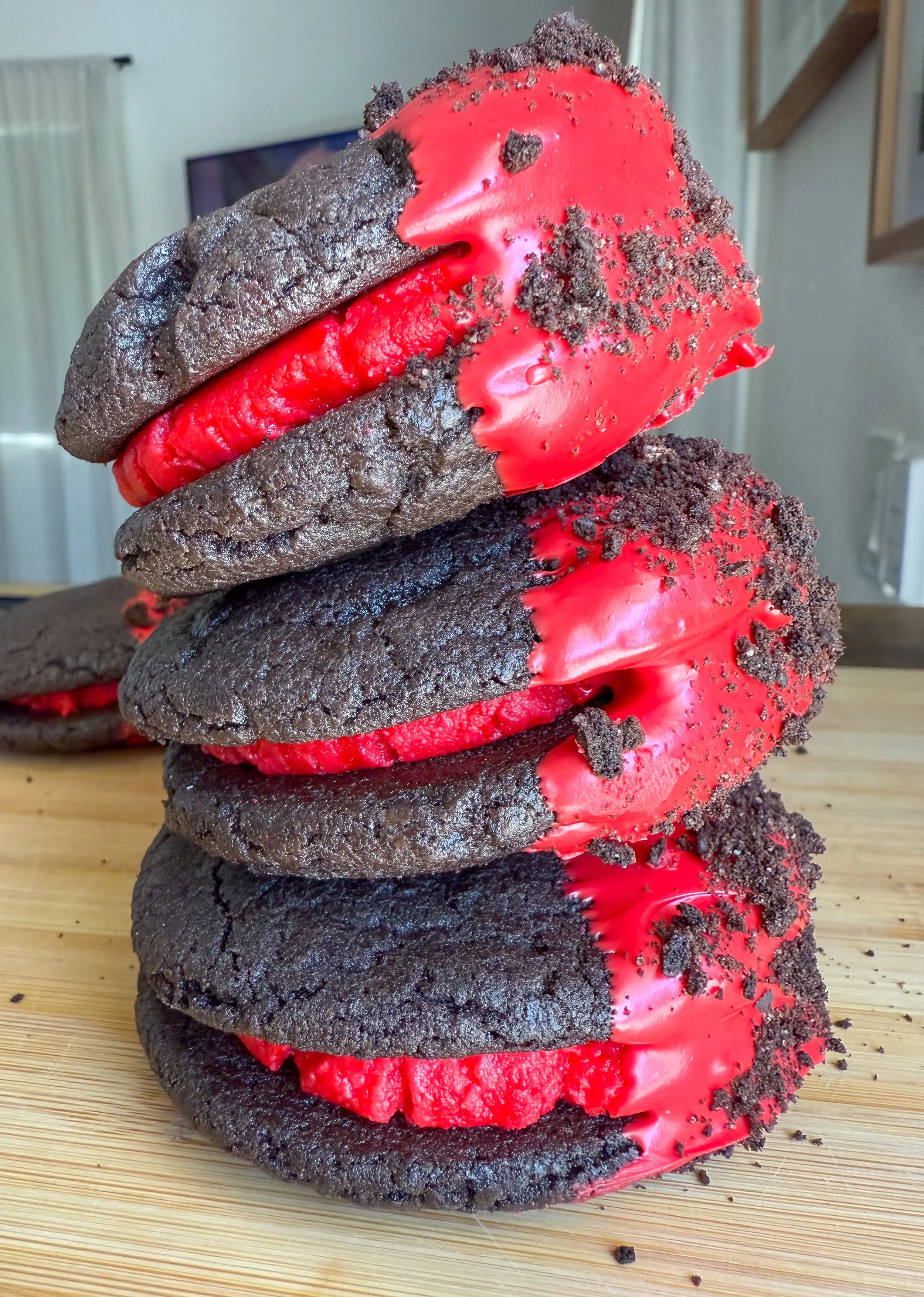 ✨ Elf’s Christmas Chaos Cookie – A red cookie dough bursting with Oreo, Biscoff, and Chips Ahoy chunks, stuffed with creamy cookie dough fudge.