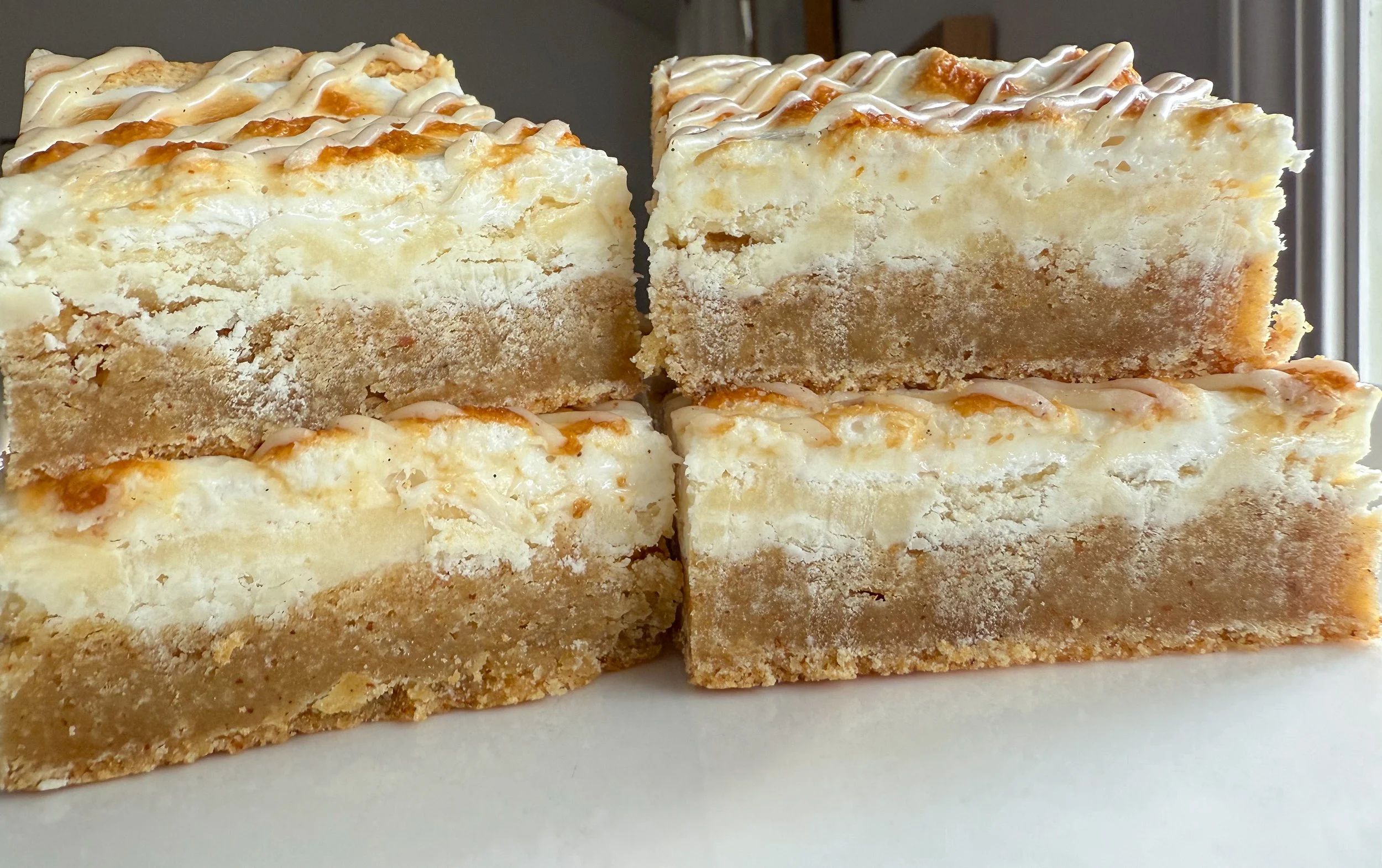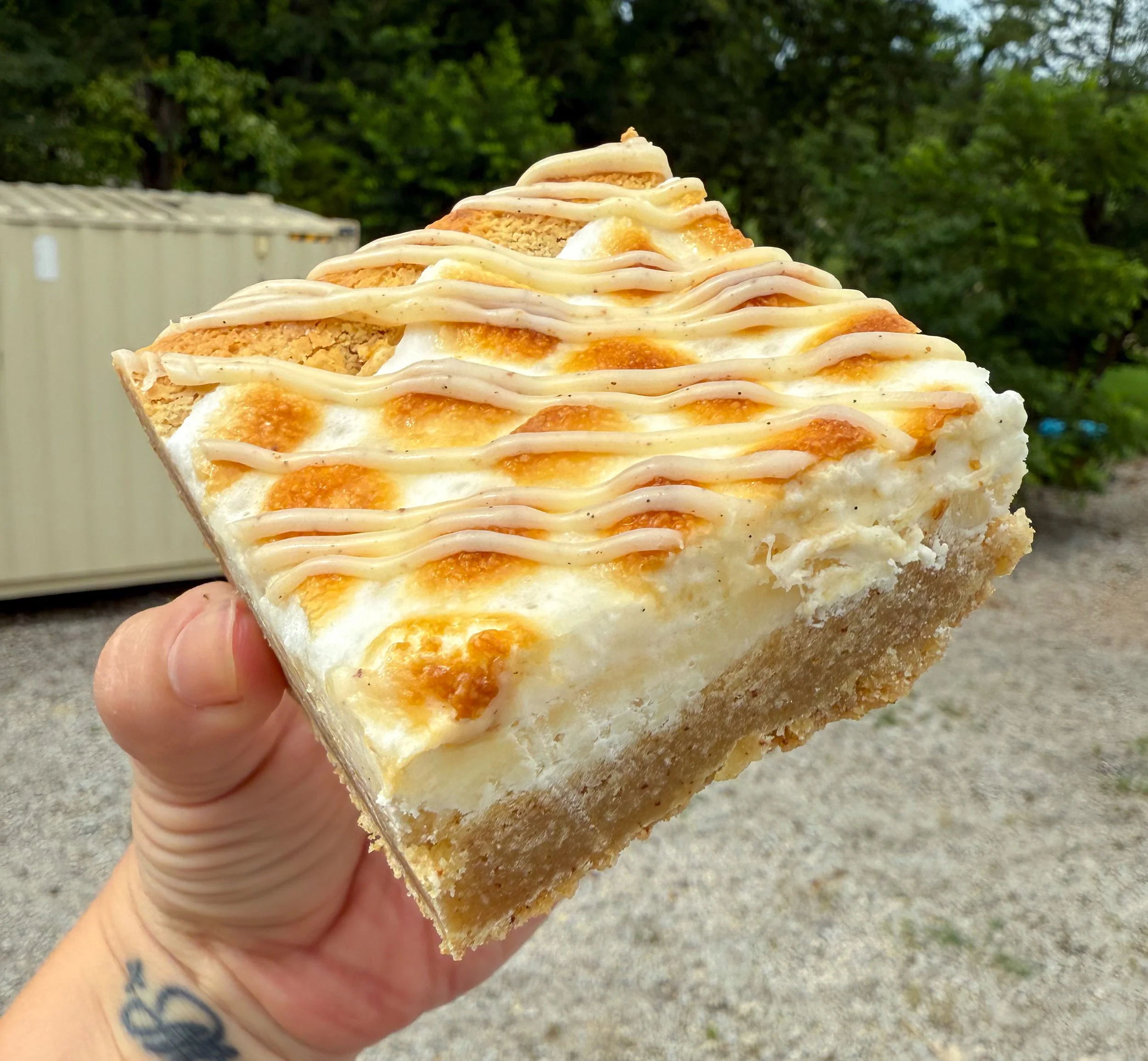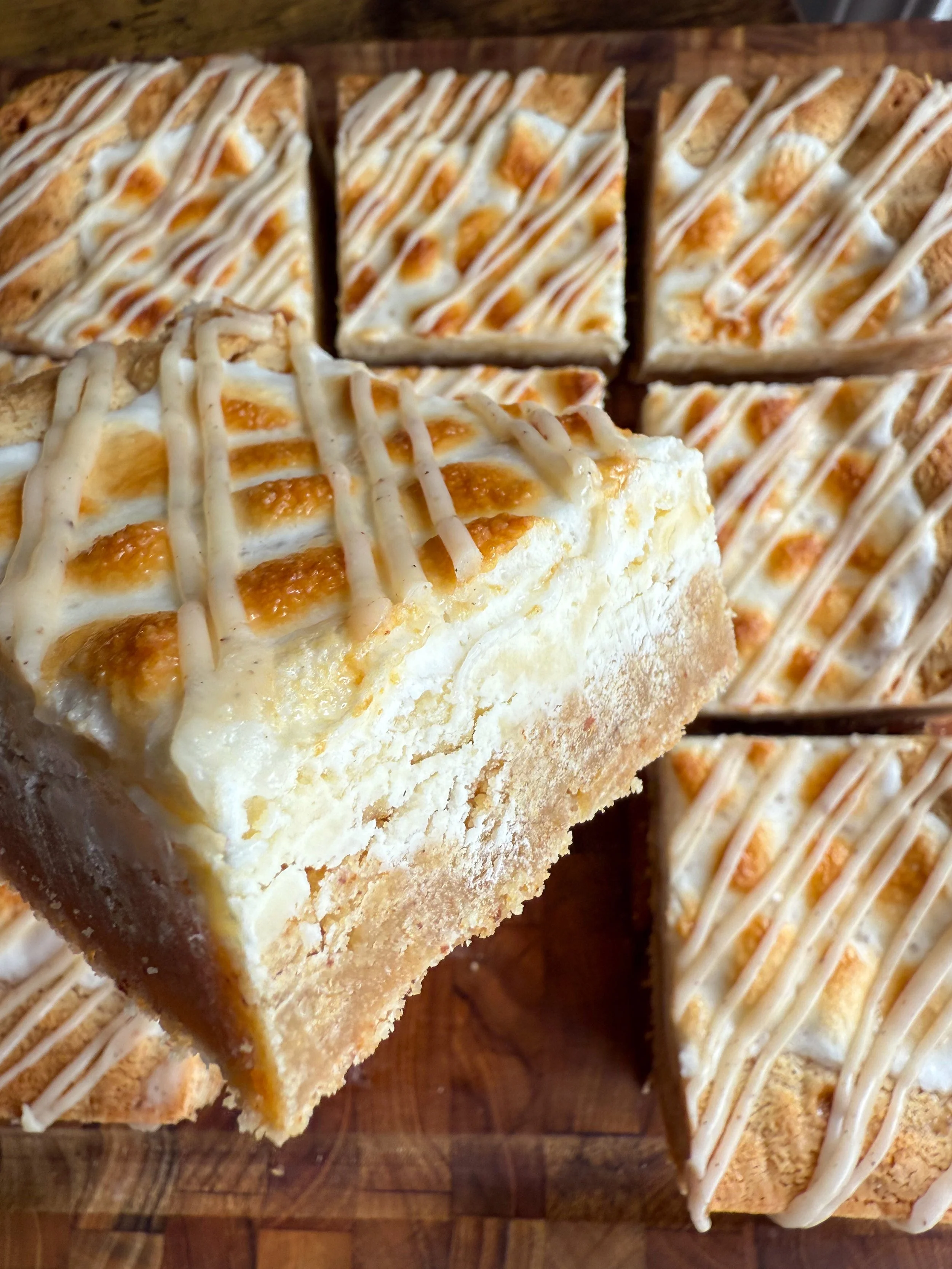 Peach Cobbler Bar – Homemade juicy peach filling tucked inside a cinnamon cookie base and crowned with cookie “crumble” topping. Comforting, nostalgic, and bakery-case ready.
