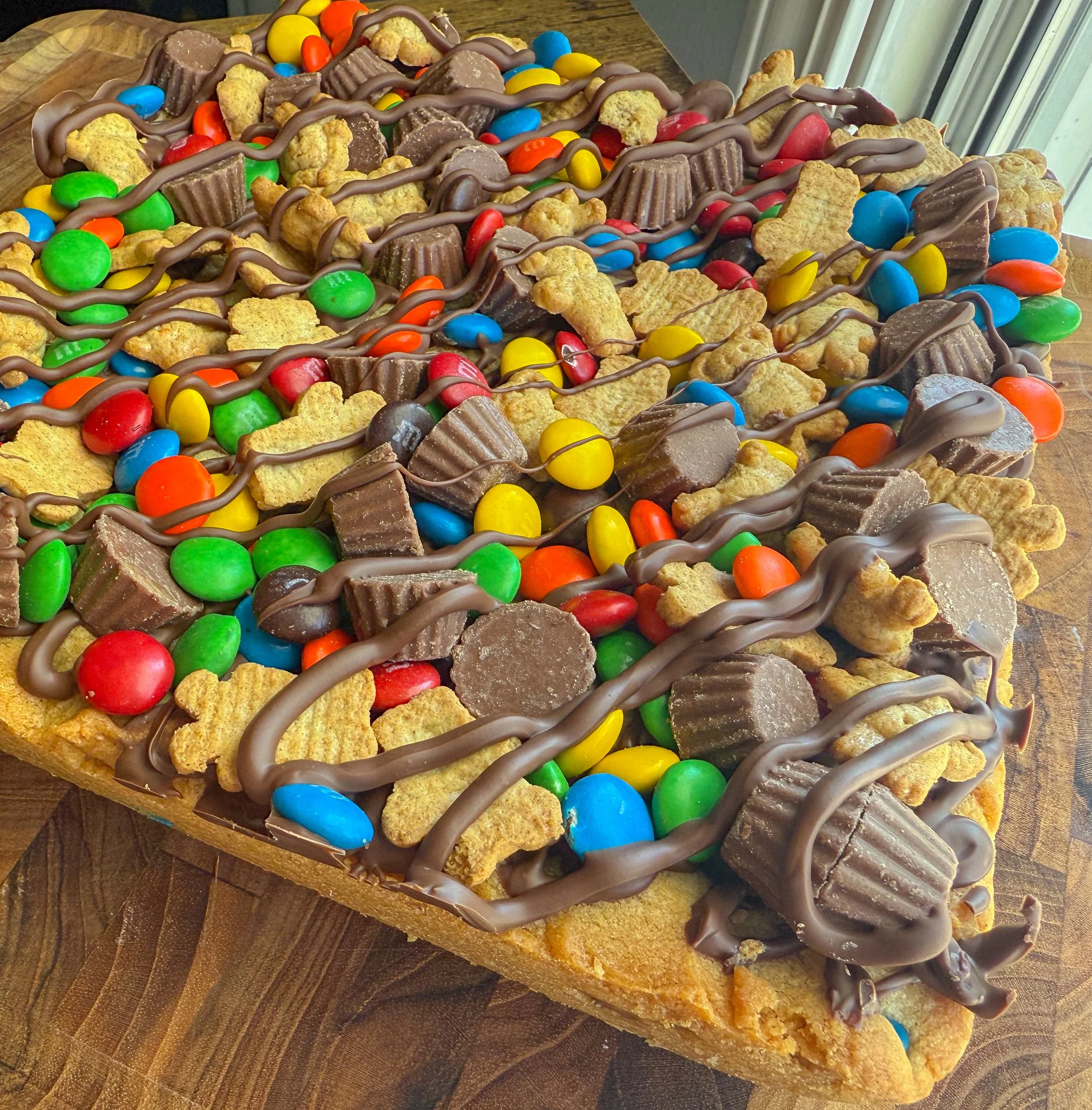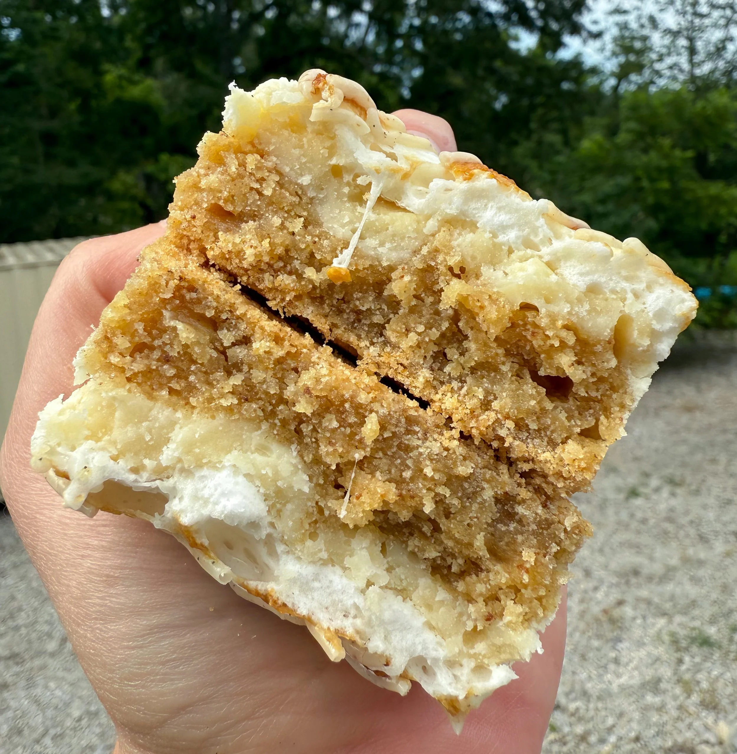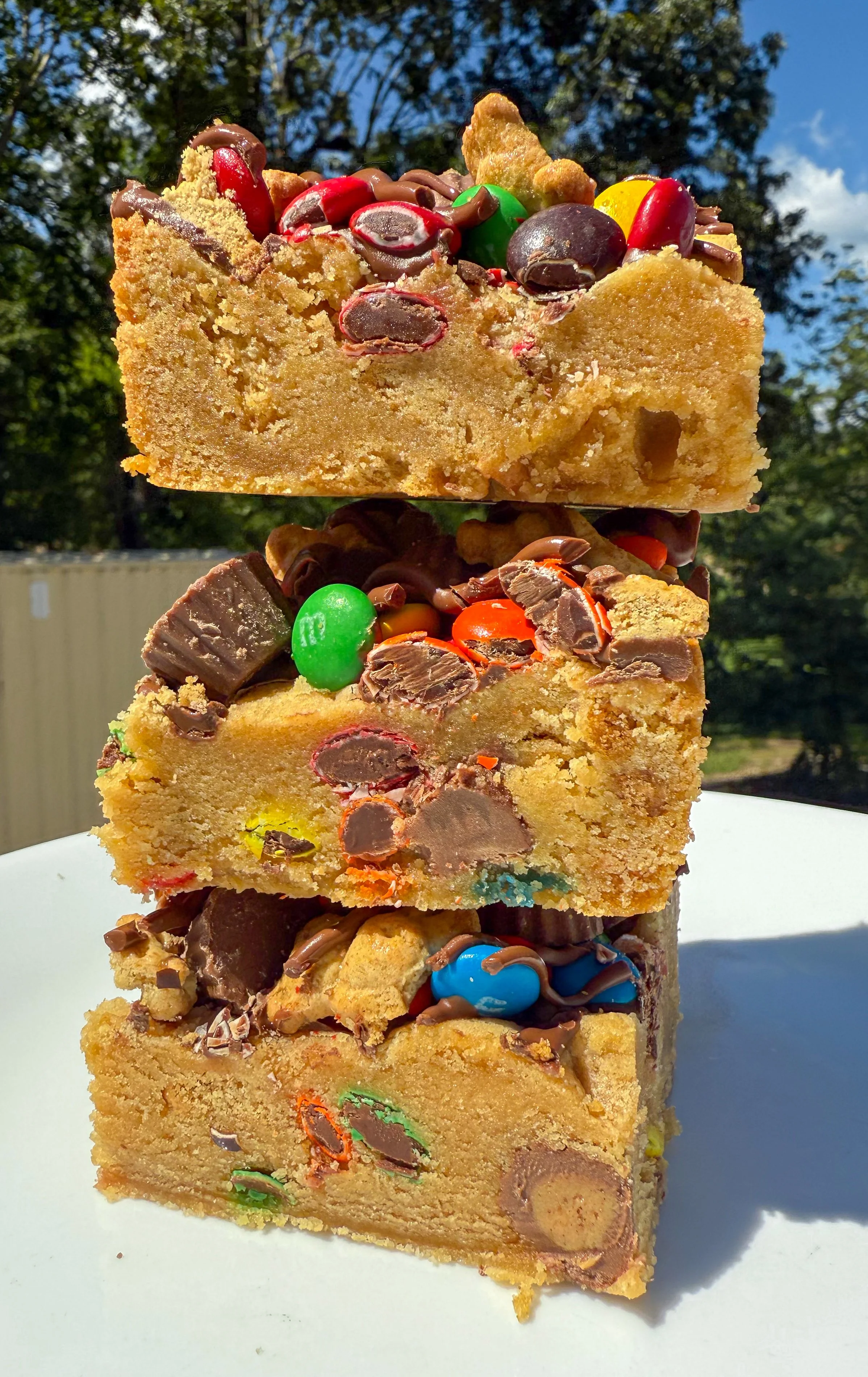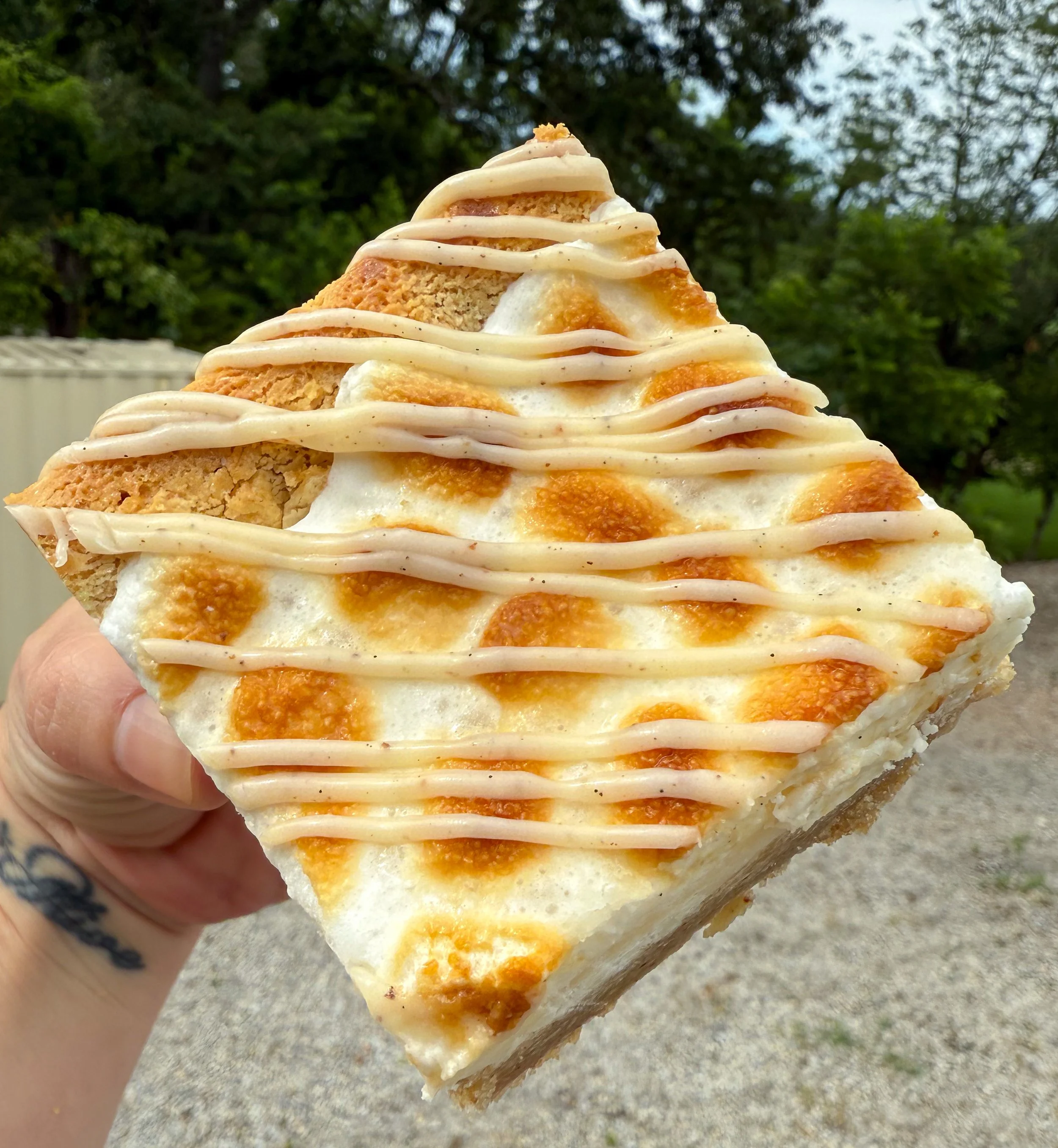 Peach Cobbler Bar – Homemade juicy peach filling tucked inside a cinnamon cookie base and crowned with cookie “crumble” topping. Comforting, nostalgic, and bakery-case ready.